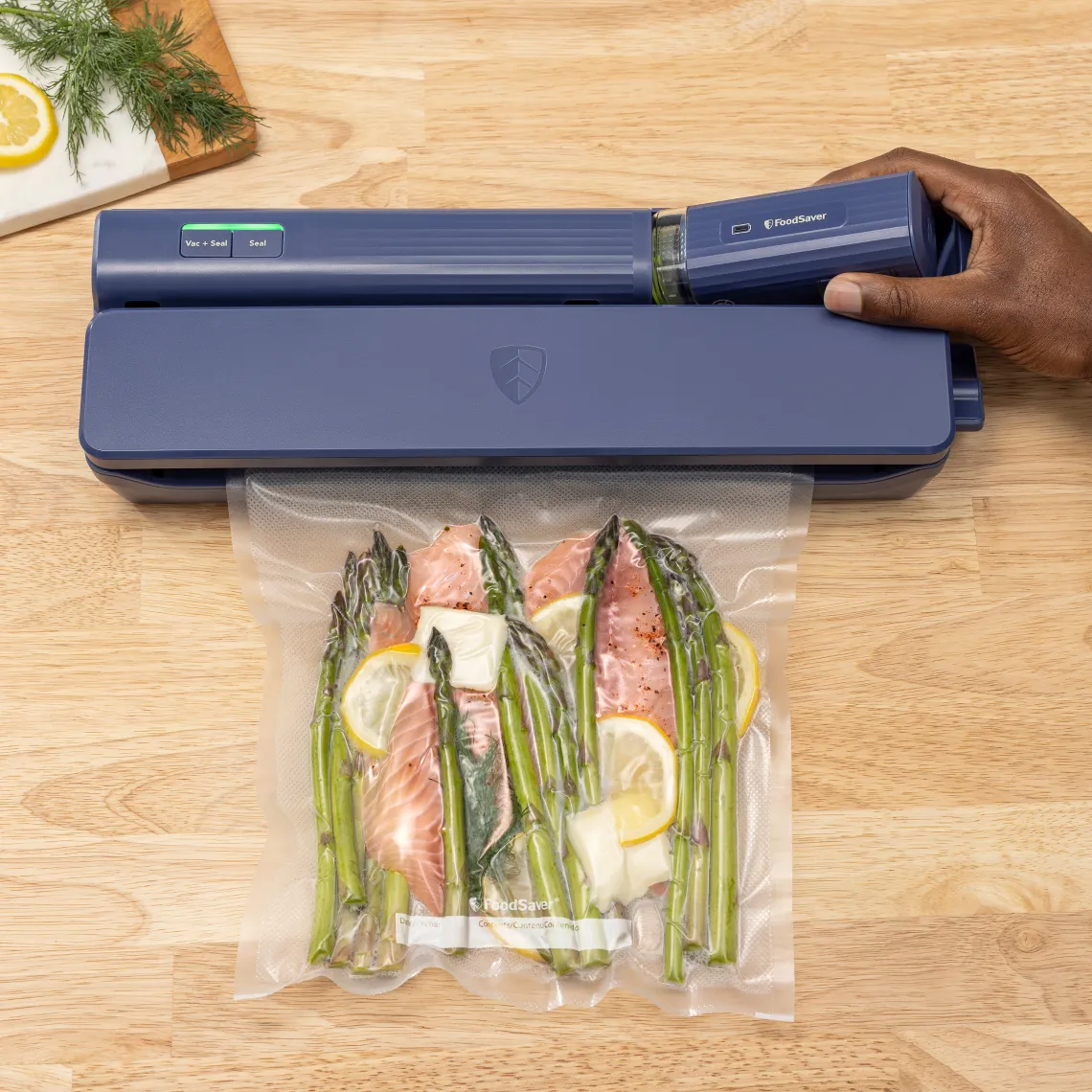 This first-to-market, innovative vacuum sealer combines countertop convenience with a detachable cordless handheld unit, ensuring food stays fresher for longer. As the only vacuum sealing system on the market to include a detachable cordless handheld unit, users can easily vacuum seal, heat seal, and marinate all with one device. The handheld unit allows for quick marination, eliminating hours of waiting. Plus, the long-lasting battery lets you seal up to 35 zipper quart bags on a single charge. Its compact design fits neatly in cabinets or drawers, and the fingerprint-resistant matte indigo blue finish adds a touch of style to the kitchen.